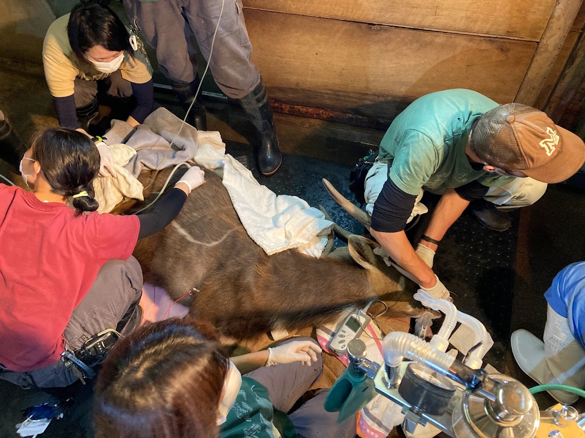 また、9月末には残念ながらシタツンガの“ツンタ”が死亡しました。“ツンタ”は過去に鼻出血が続いたため、何度か岩手大学の大動物の専門の獣医師と麻酔をかけて内視鏡の検査をしたことがあります。晩年の体調は万全ではなかったものの、飲み薬で鼻出血は見られなくなり、食欲も安定していたので残念です。死因は現在も精査中ですが解剖では肺炎を起こしていたことが分かりました。また、死後に岩手大学でCT検査を行い、過去の鼻出血は口腔内に原因があることがわかりました。動物園の動物たちは病気になっても生前の確定診断が難しい場合が多く、その点はこれからも医療環境を整え、獣医師の技術を高めていく必要があります。さらに、死後の情報もとても大切で、動物たちの死を無駄にしないよう丁寧に原因を追究していく事が大切だと、ツンタの死を通じて改めて感じました。