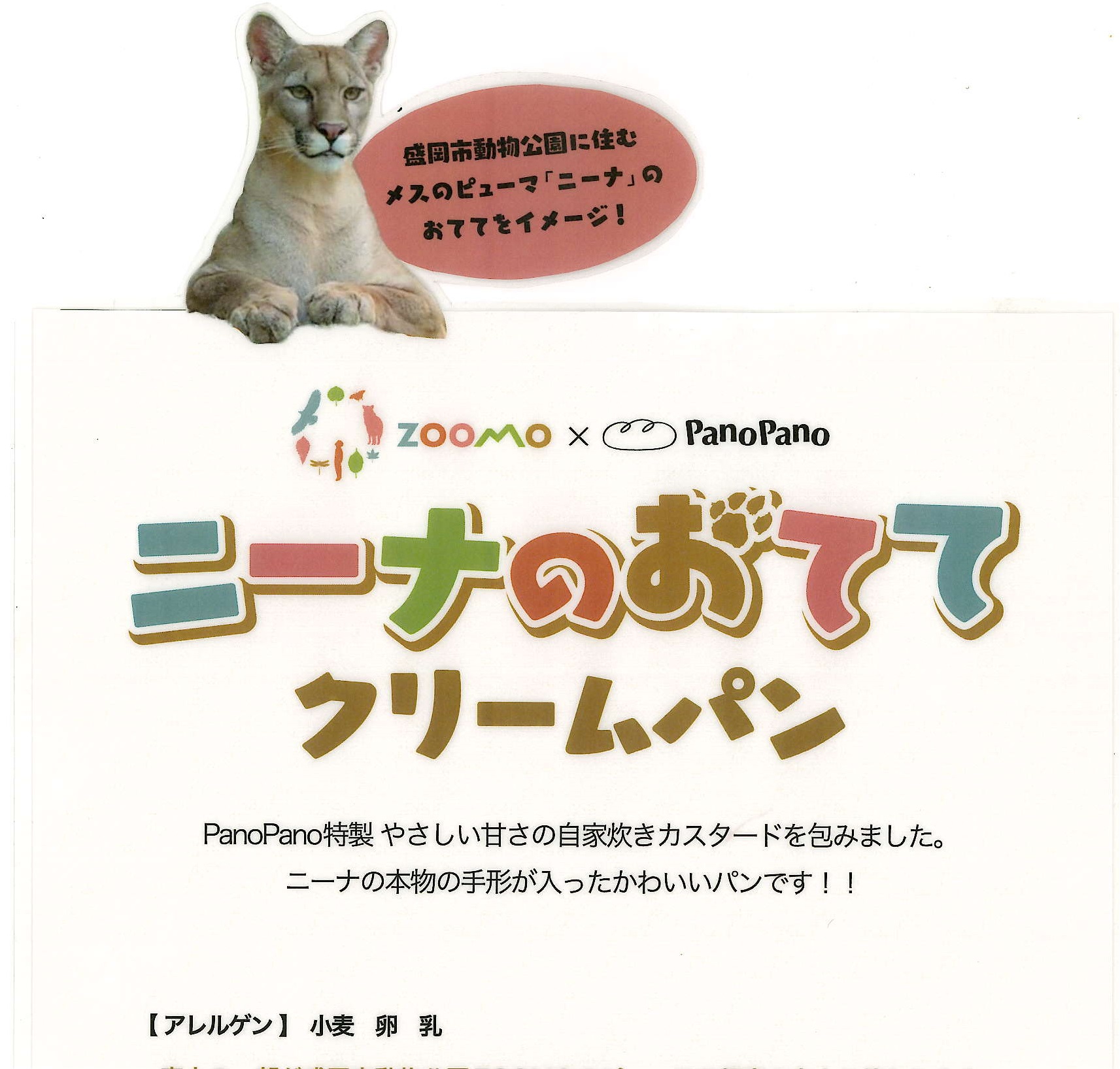 PanoPano向中野店のご協力により、第一弾として人気商品の一つでもある自家炊きカスタードのクリームパンと当園の人気動物の一つでもあるピューマとを掛け合わせ、【ピューマのニーナのおててクリームパン】が商品化されました。