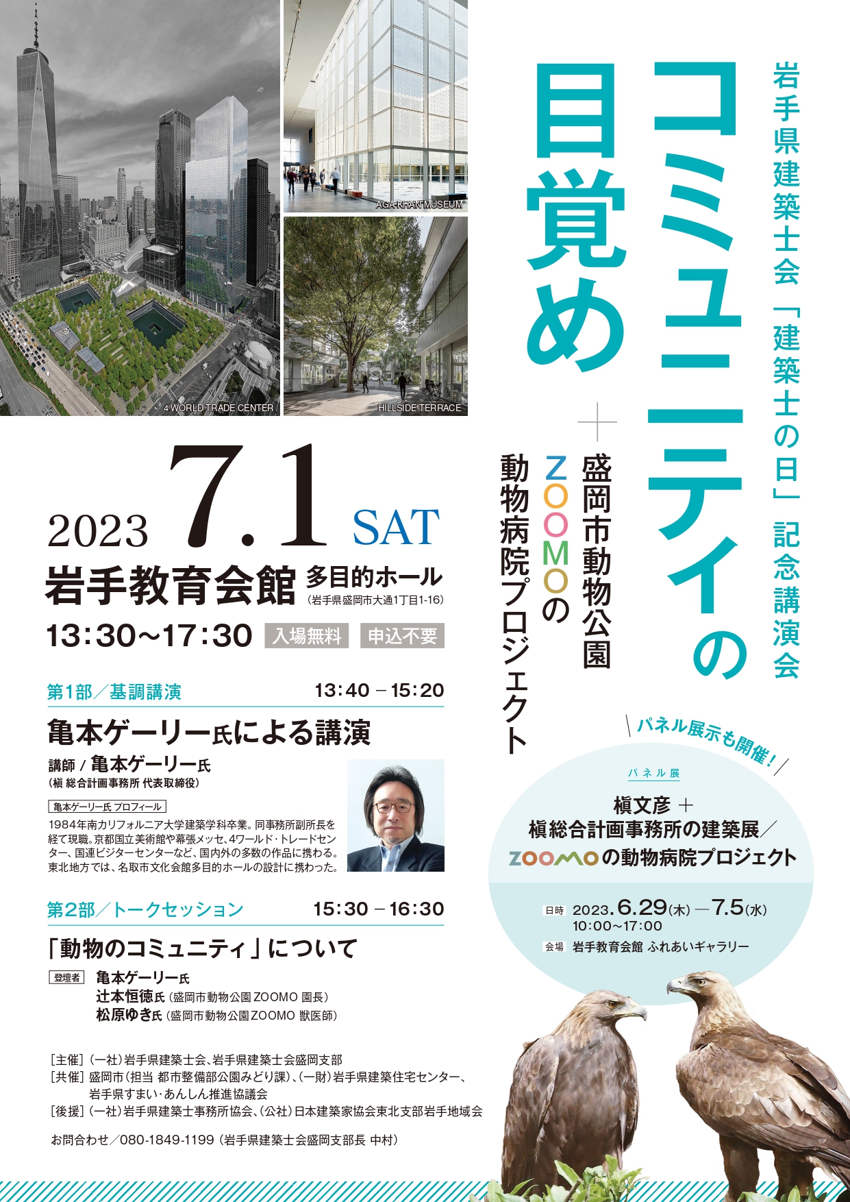 盛岡市動物公園ZOOMOの動物病院の建設において、2022年5月14日に槇総合計画事務所と盛岡市およびZOOMOを運営する株式会社もりおかパークマネジメントで3者協定を締結しました。このたび岩手県建築士会主催で「建築士の日」である2023年7月1日(土)に記念講演会【コミュニティの目覚め+盛岡市動物公園ZOOMOの動物病院プロジェクト】を開催していただけることになりました。