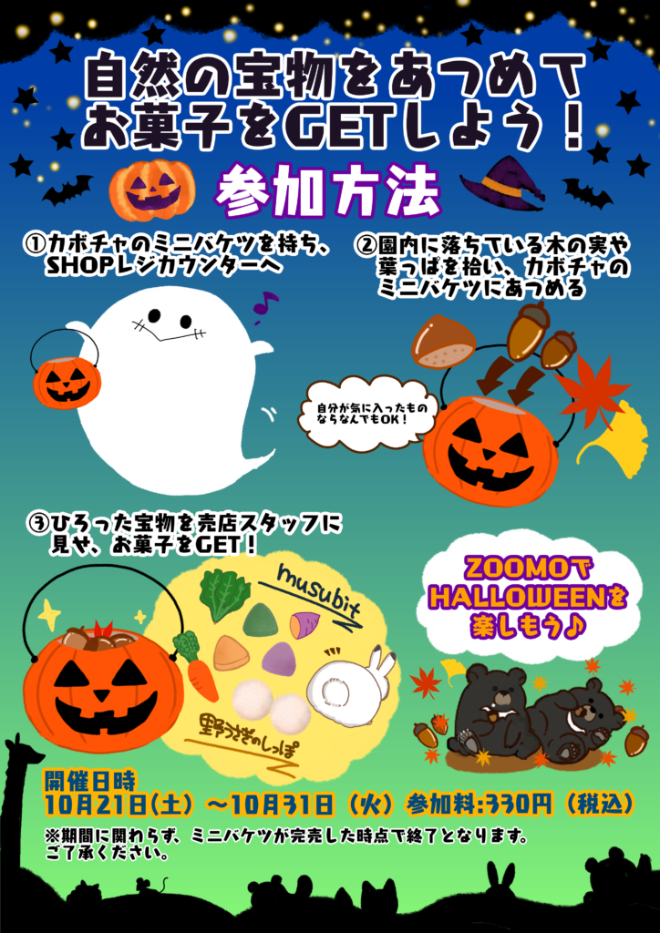 カボチャのミニバケツ(参加料込み330円)をご購入いただいた後、キレイだと思った自然の中にある宝物(木の実や葉っぱ、石など)をバケツに集めてきてもらい、レジにて宝物を見せてくれたらお菓子をプレゼントします。(ミニバケツが完売次第、終了)