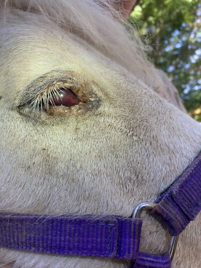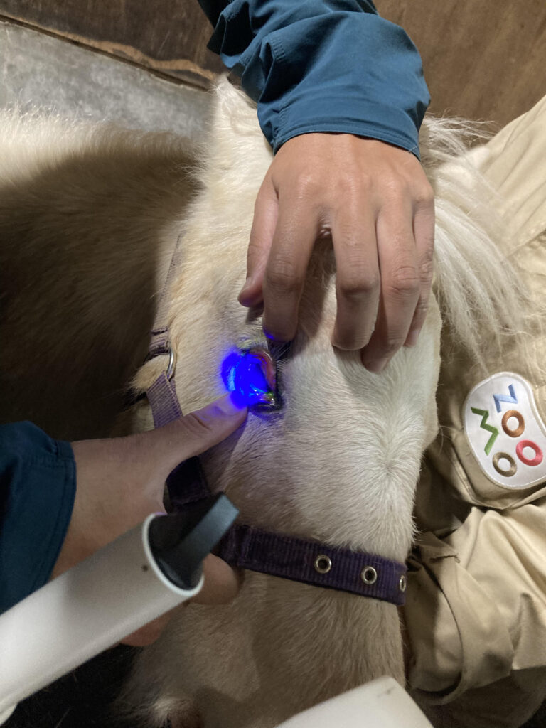 ポニーの“モモ”の右眼の出血は、恐らく仲間の“キラ”との小競り合いが原因と思われます。たまたま蹴りが眼に当たってしまったのだと思いますが、発見当初は眼の表面には大きな傷はなく、内部に出血が見られました。炎症と出血の治療を継続してもなかなか回復せず涙が出ていたので、その後、馬の専門の先生たちに診てもらいました。眼圧や内部を確認する検査などを行いましたが異常はなく、どうやら気にして目を擦ってしまうことが原因で、角膜に薄く傷が出来ていたようです。擦ることを止めないと繰り返してしまうので“モモ”専用の眼帯を作製しました。眼帯はお椀やカゴや服などを“モモ”の顔の形にうまく合わせて作製し、その効果もあって少ずつ傷は良くなりました。今では出血の跡もなくなり、1ヵ月ちょっとかかった治療もようやく終了しました。長い間目薬などの治療を頑張った“モモ”ですが、目薬の際は眼をぎゅっと瞑って抵抗(我慢)していました。本当にお利口で助かりました。