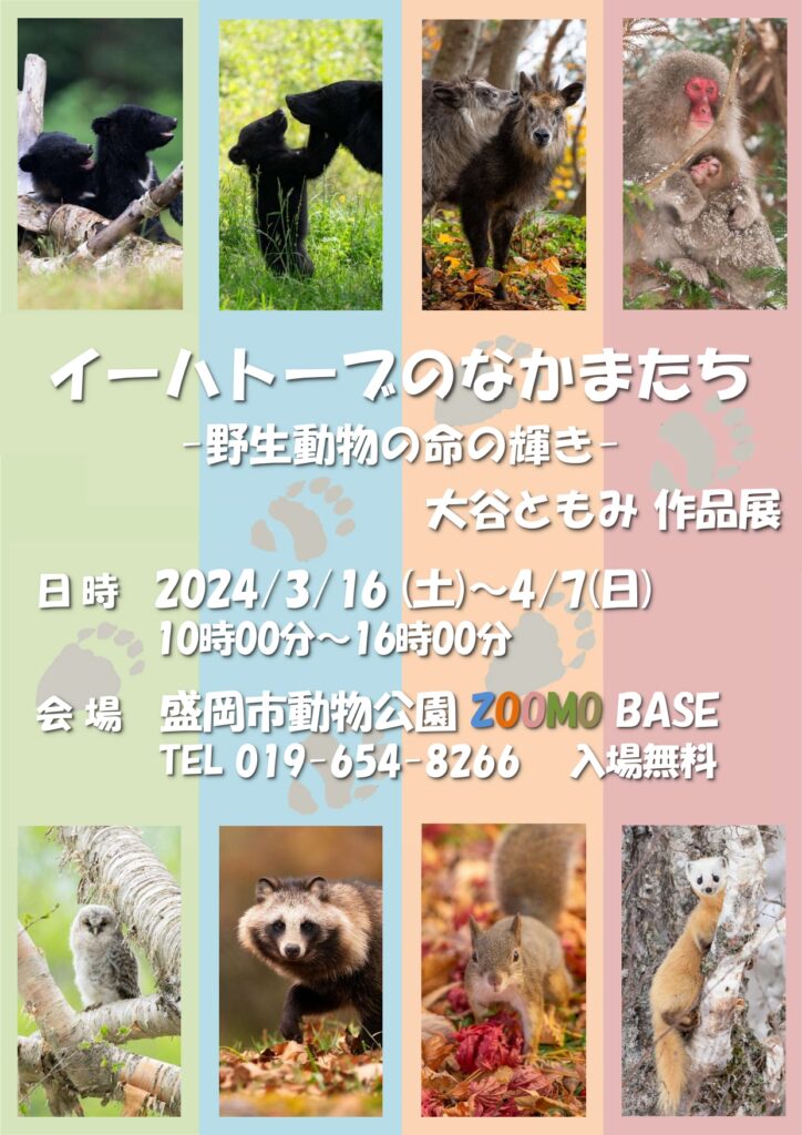 園内に入ってすぐのZOOMOBASE内レクチャースペースにて、自然を愛する写真家 大谷ともみ氏の作品展「イーハトーブのなかまたち -野生動物の命の輝き-」を開催します。