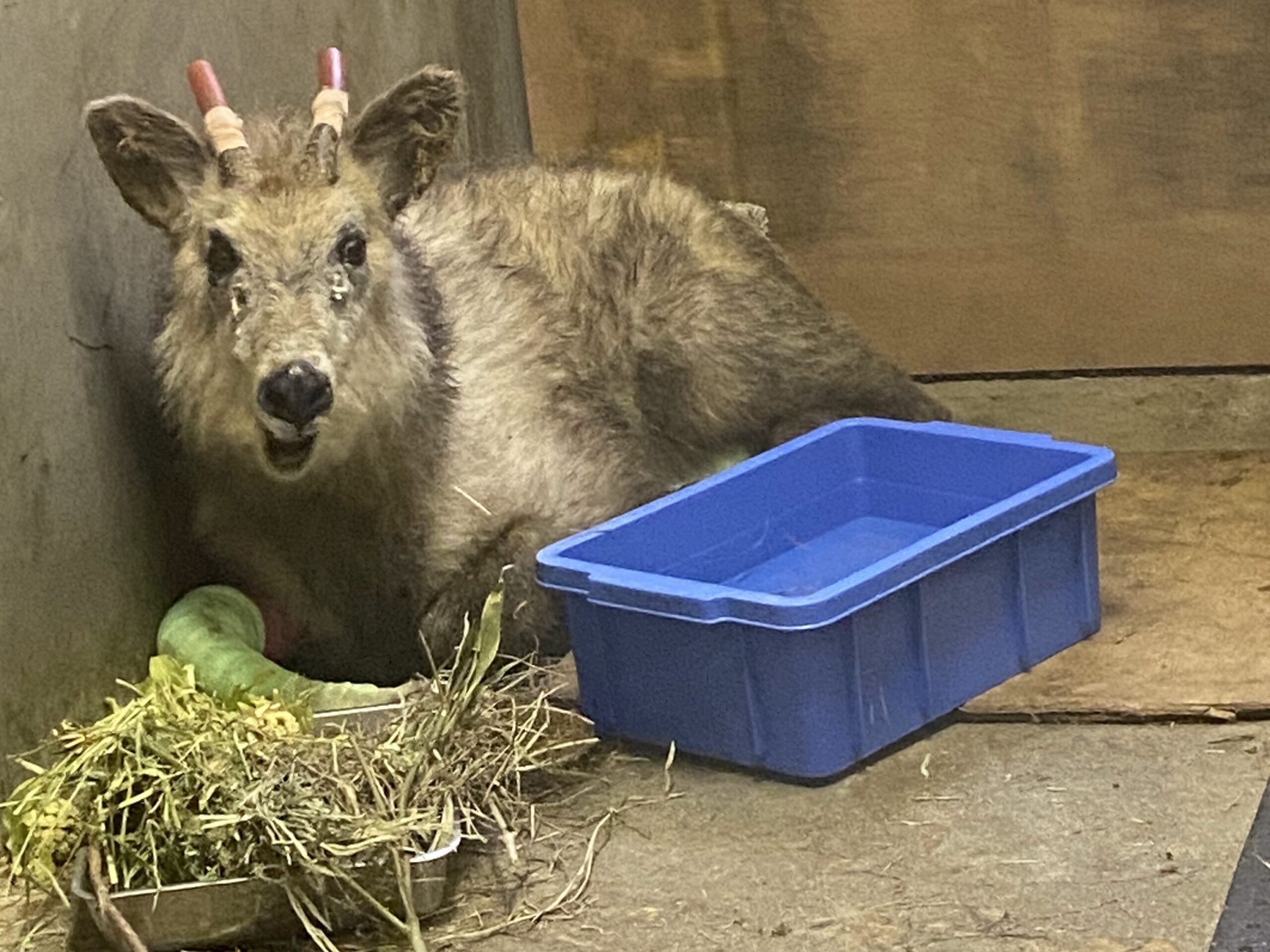 まずは交通事故に遭ったニホンカモシカです。野生の動物たちはマダニなどの寄生虫をつけてきたり、どのような病原体を持っているかわからないので、お世話や治療をするにあたりこまめなゴム手袋の交換や長靴・手指の消毒が欠かせません。