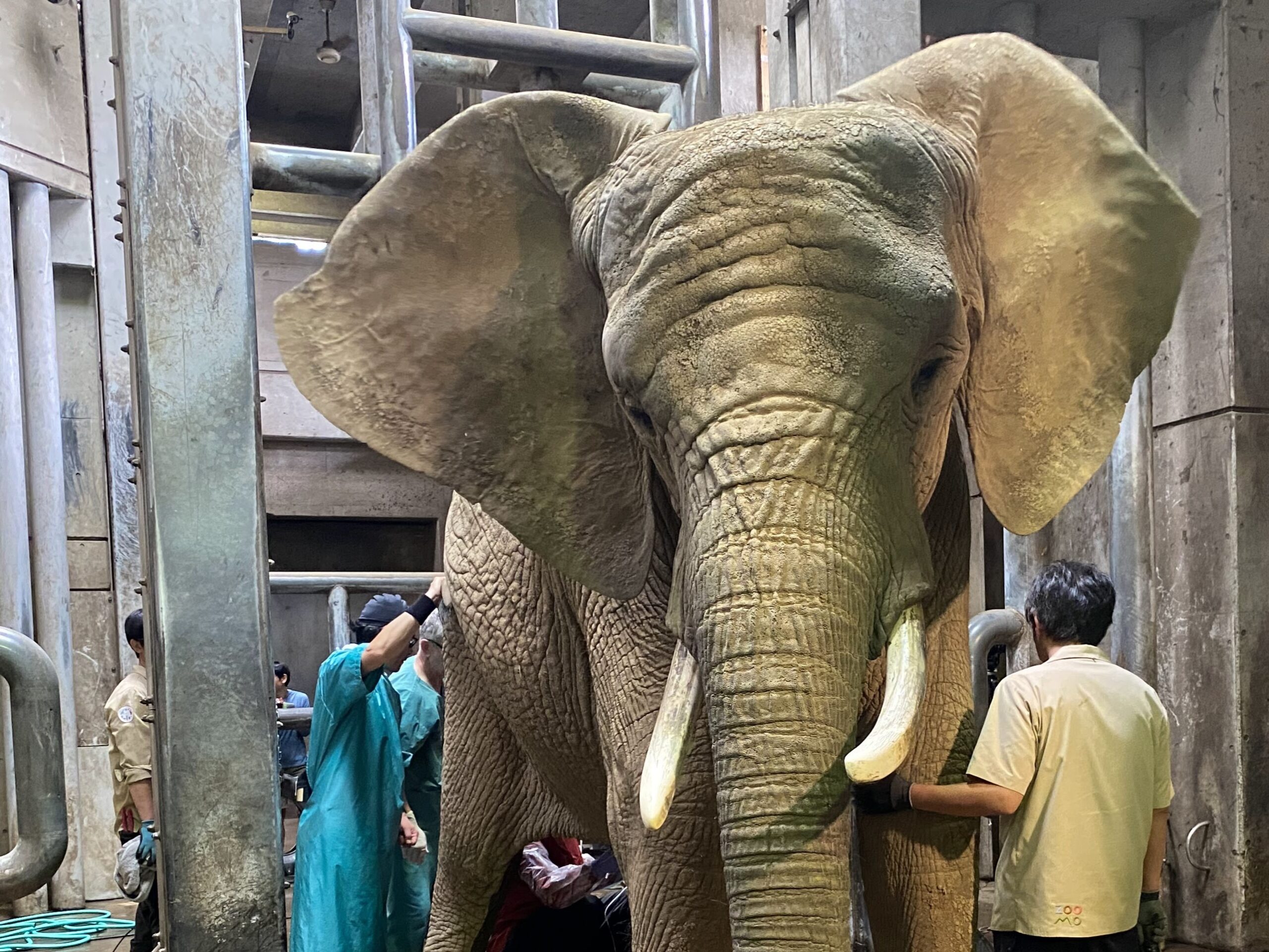 7月の初めにZOOMOでは日本初のゾウの人工授精という大仕事を終えました。ドイツから専門家を招いて行ったのですが、花巻空港まで迎えに行って実際に会うまで本当に来てくれるのか内心ドキドキしていました。血液検査でのホルモンの確認をしつつ、アフリカゾウのメス“マオ”の子宮や卵巣の状態を確認するエコーのタイミングを計ります。これまで約2年間にわたりトレーニングを行ってきた成果もあり、鎮静なしでエコー検査をすることができ、心配されていた子宮などの病変も見つかりませんでした。まずは第1関門突破です。卵巣の状態とホルモンの検査を確認しつつ授精のタイミングを見極めます。専門家の先生方の来日3日目、帰国する日の早朝から人工授精を行うこととなりました。長い間じっとしてもらう処置になるので、“マオ”に鎮静をかけます。エコーで確認するとちょうど排卵したばかりの様子。良いタイミングでの授精となりました。用いた精液は南アフリカの野生のオスゾウから採られたものです。2頭分、合計4本の精液を注入しました。あとはなるべく“マオ”にストレスをかけずに妊娠してくれるのを願うのみです。妊娠したかわかるのは3か月半ほど先となります。