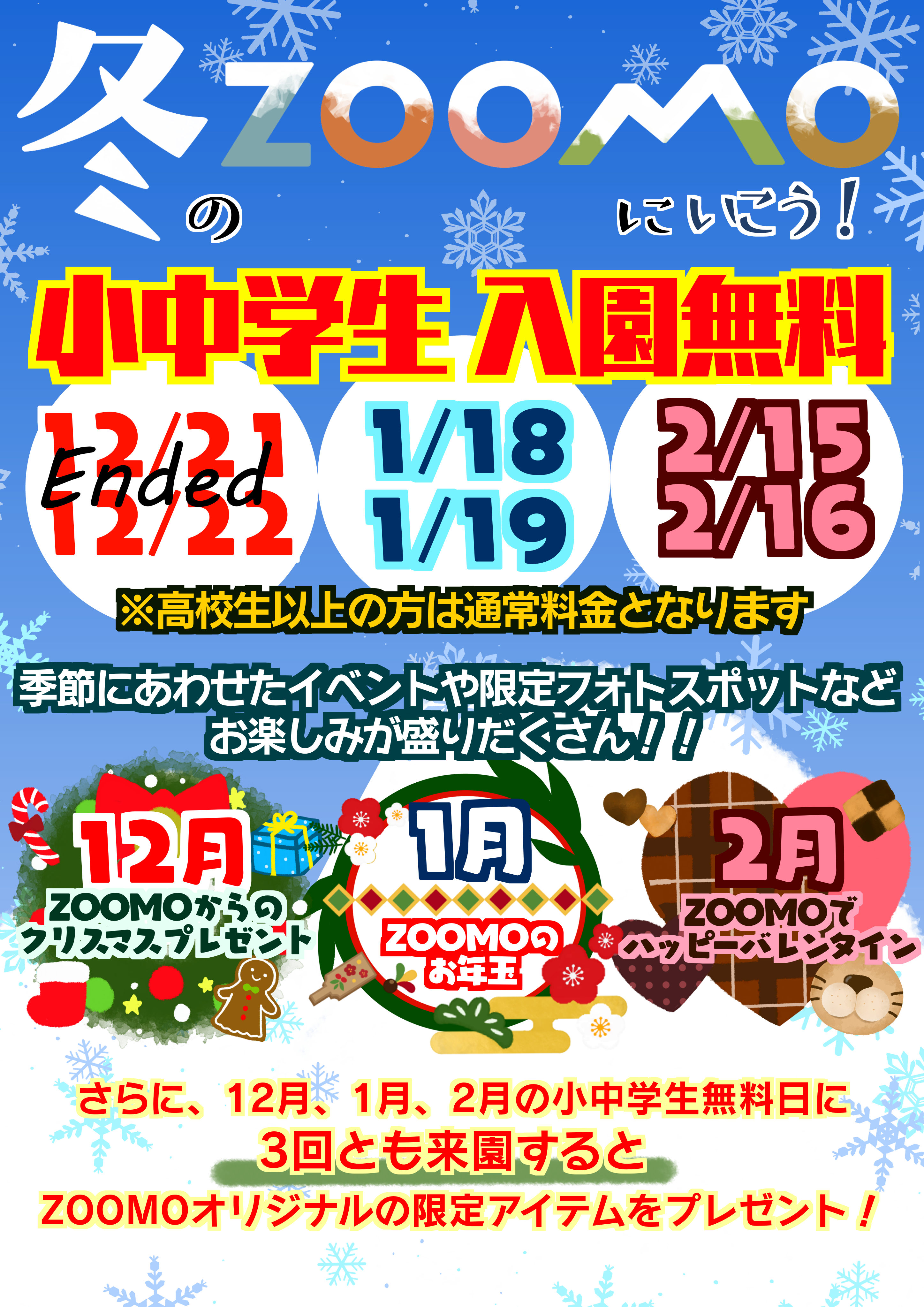 さらに、12月、1月、2月の小中学生無料日に3回とも来園するとZOOMOオリジナルの限定アイテムをプレゼント!