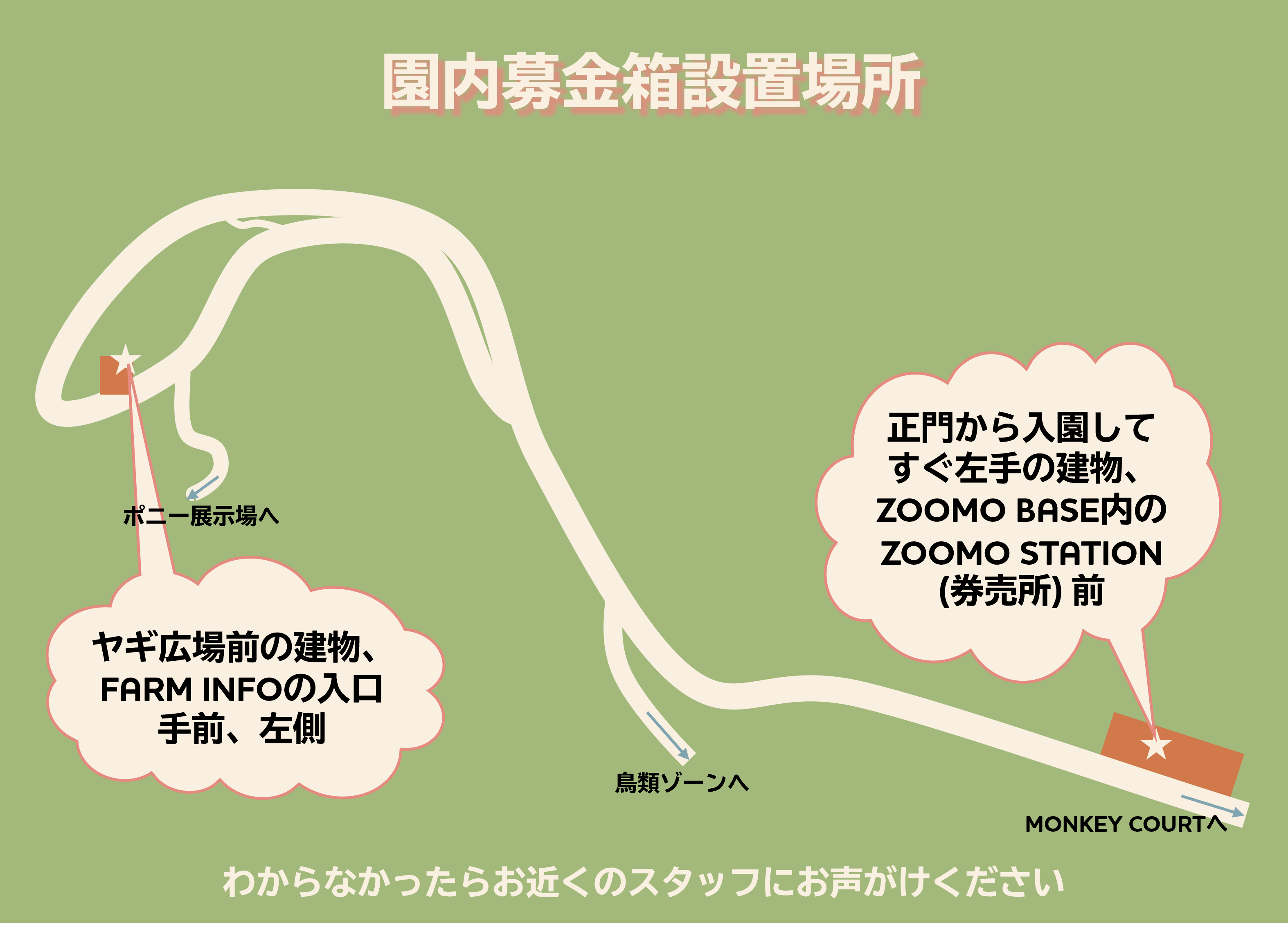 園内2か所に新動物病院建設のための募金箱を設置しています。1円からご支援が可能です。