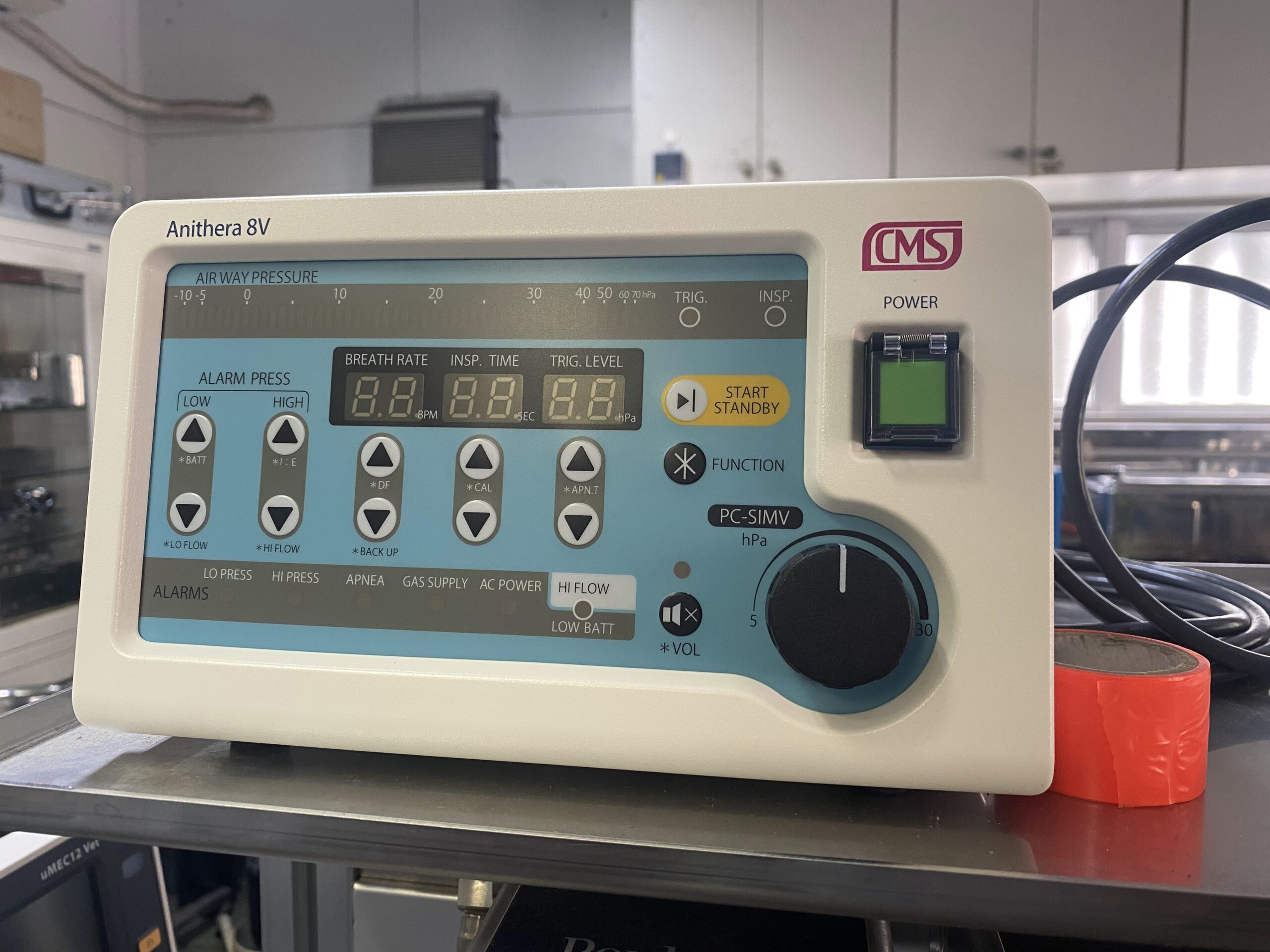 ご寄付いただいた機器は2つあり、1つは人工呼吸器です。動物に麻酔をかけた際などに自動で決まった時間や圧で空気を送り込んでくれる機械です。麻酔中は常に呼吸監視が必要ですが、動物の状態により、呼吸停止が起きたり呼吸が不安定になったりすることもあります。人工的に呼吸をコントロールすることで、術者が処置に集中することができ、麻酔中の事故のリスクも減らすこともできます。これまで人工呼吸器がなかったため、呼吸の調整は酸素バッグを使用して手動で行っていました。この人工呼吸器により、より長時間の手術や麻酔下処置を積極的に行うことができます。