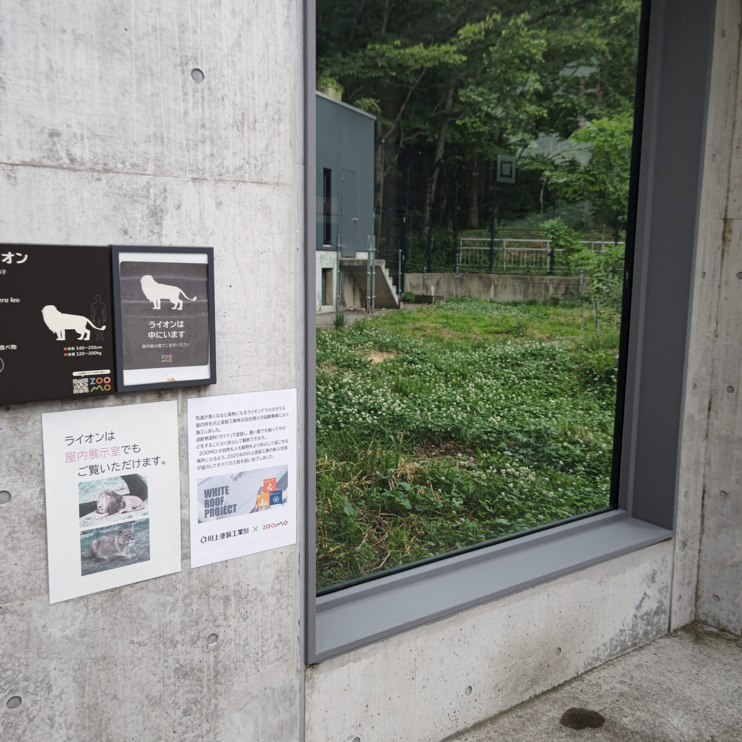 リニューアル後の人気スポット、ツキノワグマテラスとライオンテラスに設置された大型ガラスの枠は、夏場に高温となり、特に小さなお子様が手にやけどを負う恐れがあることが懸念されていました。