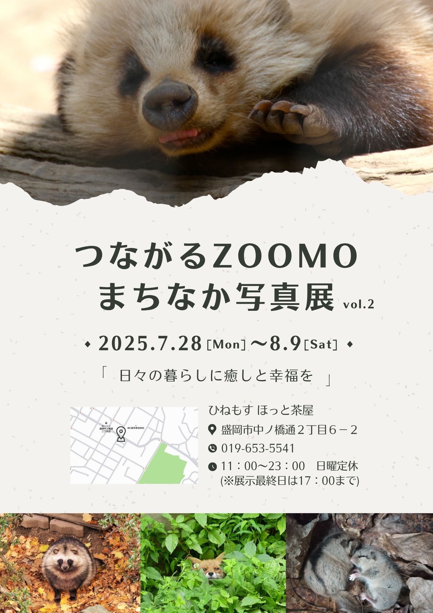 市民とのつながりをこれまで以上に大切にしたい、動物たちの愛らしい姿で少しでも温かい気持ちになってもらいたいという思いから、ギャラリーを併設する市内のカフェ「ひねもす ほっと茶屋」にて写真展「つながるZOOMO まちなか写真展 vol.2」を行うこととなりました。