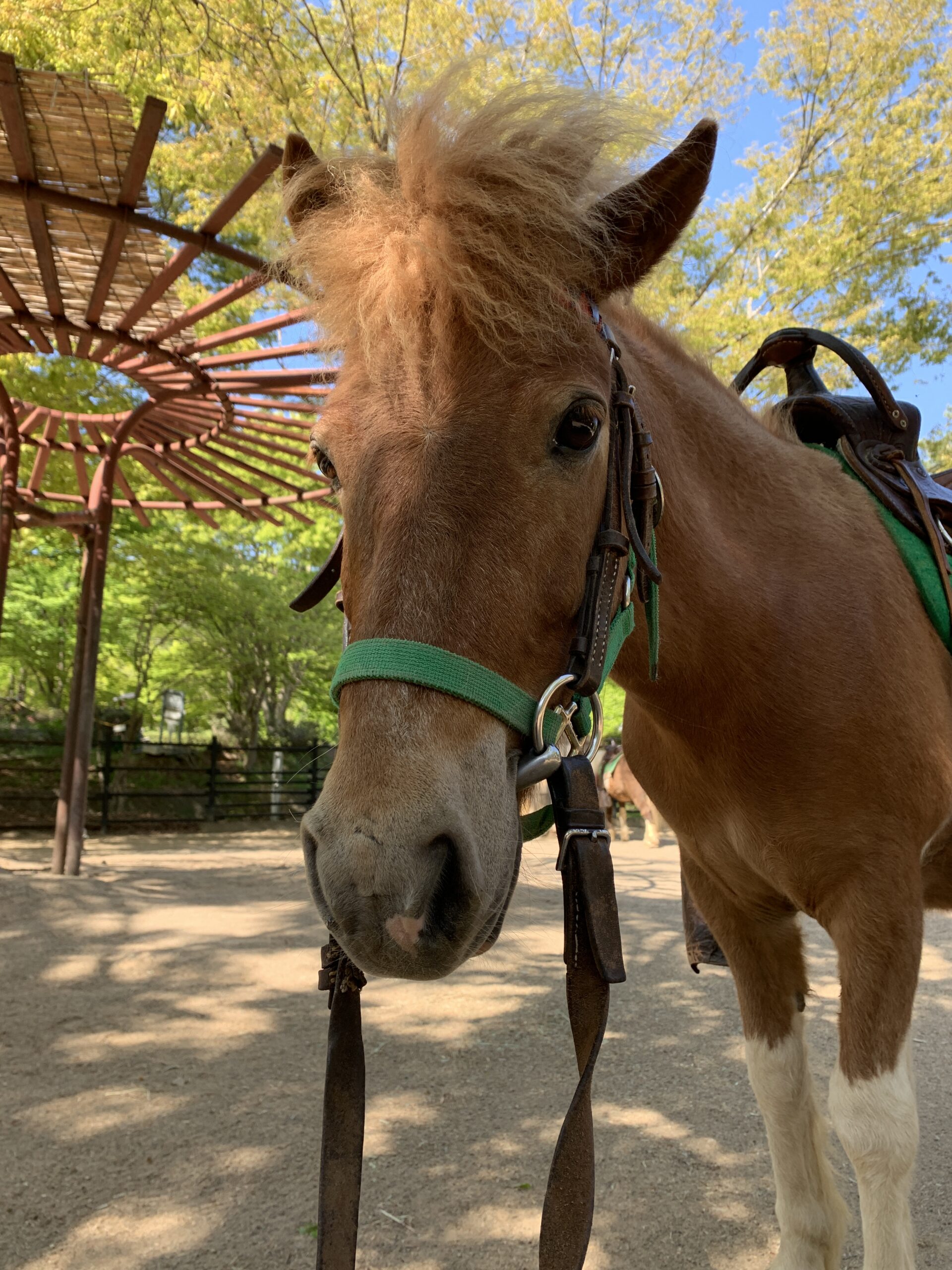 ポニーに乗ってのんびりパドックを一周します。飼育係がポニーを引いて一緒に歩きます。