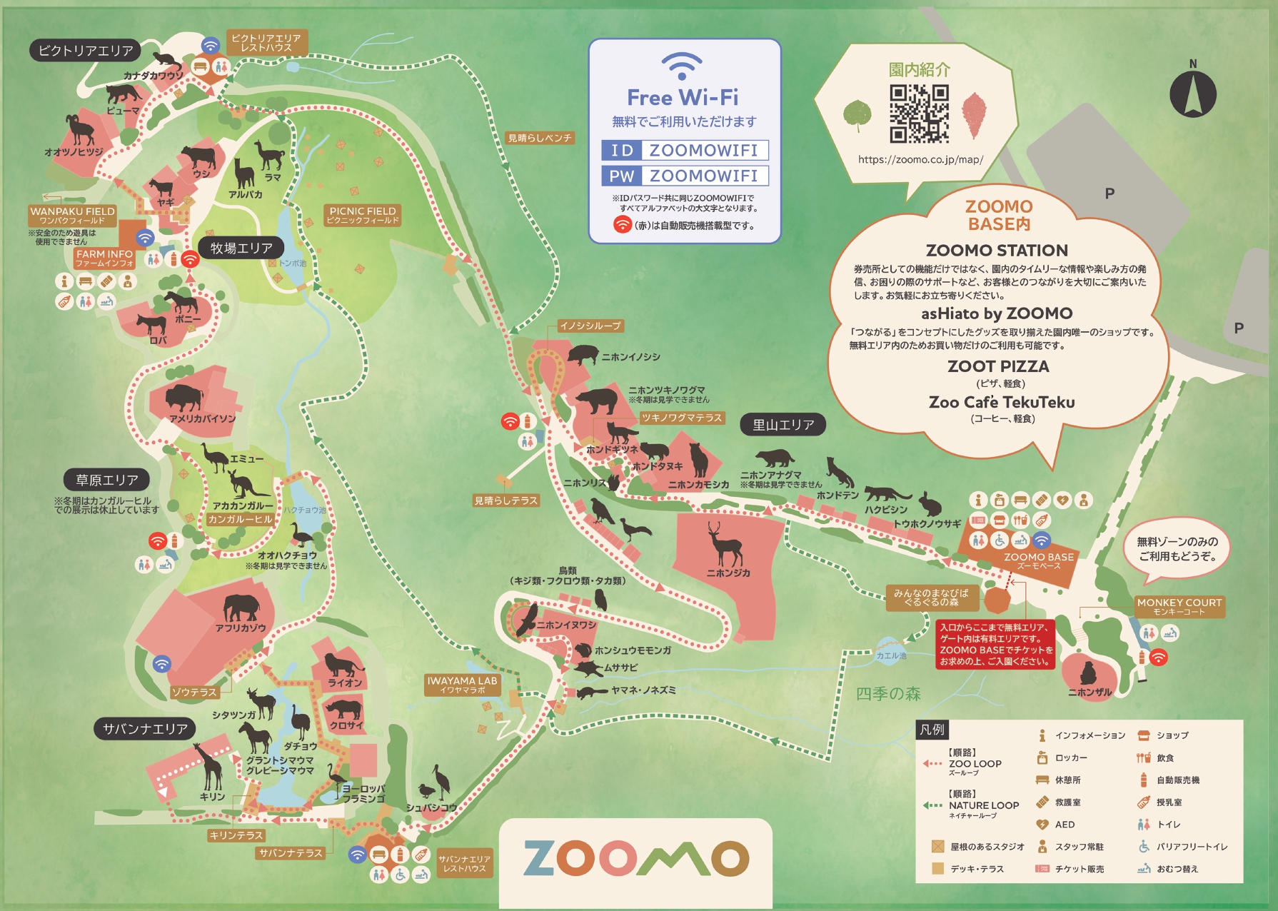 MONKEY CORTに隣接したZOOMO BASEも無料入園ゾーンとなっており、ドリンクや軽食などテイクアウトの飲食店舗、オリジナルグッズ等を取り扱うZOOMO SHOP、学習展示やレクチャースペース、園内の楽しみ方やお困りごとのサポートをするZOOMO STATION等が入っています。また、有料ゾーンへの入園ゲートもZOOMO BASE内にあります。ZOOMO BASE内ではWi-Fiがご利用いただけます。Wi-Fiをご利用いただく場合アクセスコード(セキュリティーキー)が必要となりますのでお近くのスタッフにお尋ねいただくか、またはサインボードをご確認下さい。
